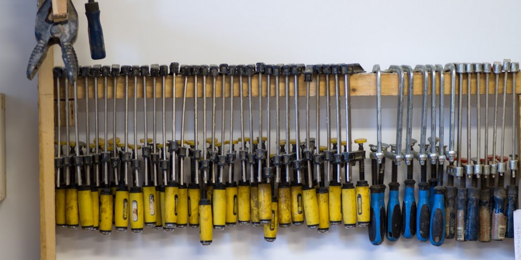 When the wood is ready for it, I can slowly start shaping it. I saw and plane it into the shapes that will make up the paddle and then let it dry for a few more months. This way I can follow the wood during the drying process and carefully select the pieces that will be assembled into each paddle. Only after the wood has gone through the two drying periods do I glue the pieces of wood together and finish them. When a paddle is finished, it consists of 13 to 19 pieces of wood.